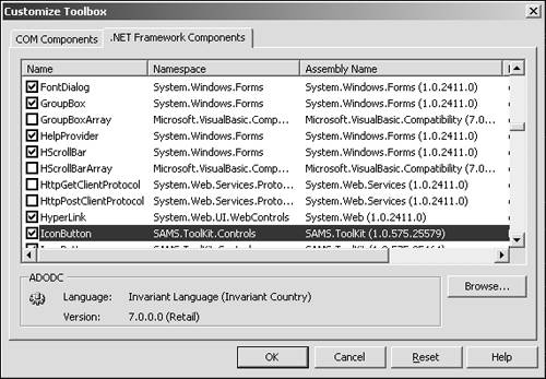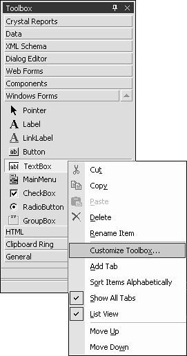 Testing the IconButton is as simple as creating a new Windows Forms project and customizing the Toolbox to display the IconButton. Create a new Windows Forms project and then right-click on the Toolbox to bring up the context menu shown in Figure 2.8, and select Customize Toolbox. This brings up the Customize Toolbox dialog, which you can use to browse for the compiled DLL created for the IconButton (see Figure 2.9).