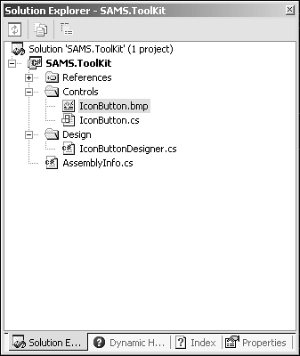 Before this chapter ends, I'd like to add a Toolbox bitmap for the IconButton. A Toolbox bitmap is the 16×16 image that appears in the Toolbox tab for the IconButton. Adding a bitmap for a control is a simple task, to say the least. All that needs to be done is to add a bitmap with the same name as the control to the project. Figure 3.7 shows the Solution with the IconButton.bmp file added in the Controls folder of the Solution.