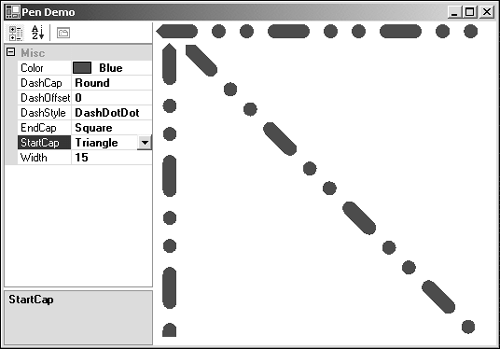 Figure 4.5 shows the interface for the Pen Demo. The property grid allows for changing the properties of the current pen to see the result.