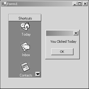 Testing the final control is a victory that should be savored. The various controls, components, and designers for the OutlookBar control and its related controls demonstrate the basic requirements for creating custom controls for Windows Forms. Figure 9.3 shows the test application displaying a MessageBox indicating which item was clicked on.