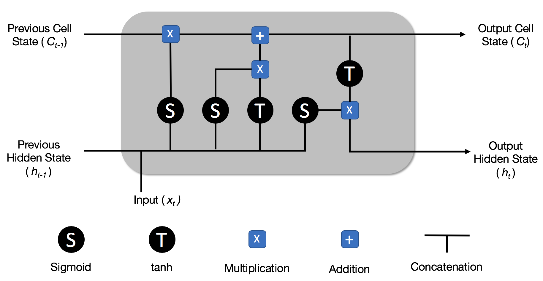 The following diagram shows a high-level overview of the repeating unit of an LSTM: