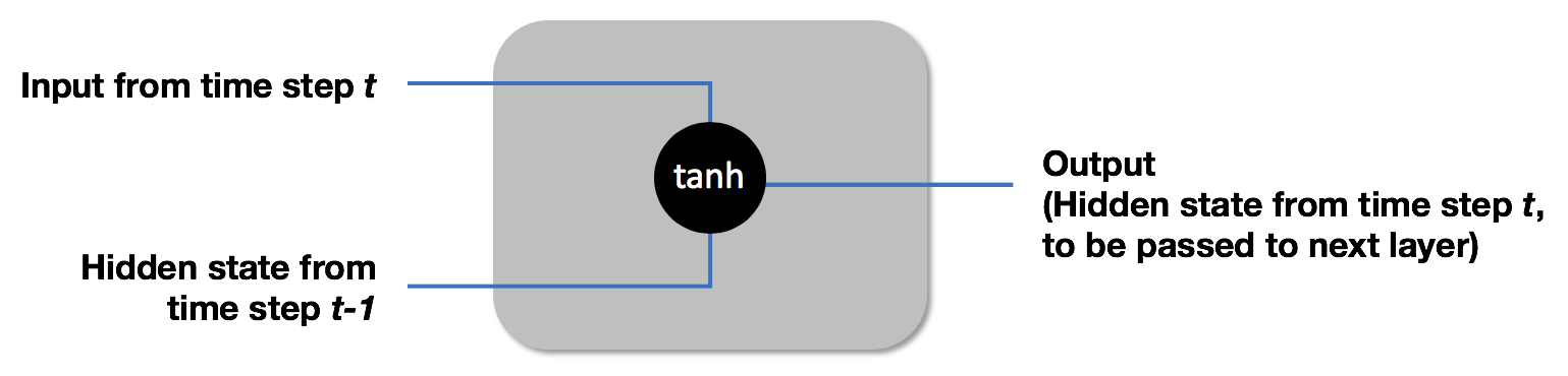 Each layer in an RNN simply sums up the two inputs and applies a tanh function to the sum. It then outputs the result, to be passed as a hidden state to the next layer. It's that simple! More formally, the output hidden state of layer t is this: