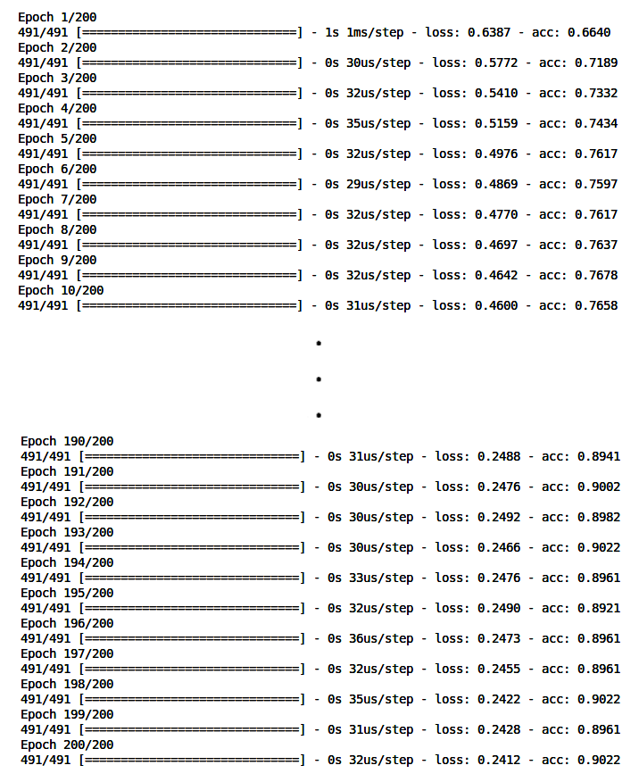 # Train the model for 200 epochsmodel.fit(X_train, y_train, epochs=200)