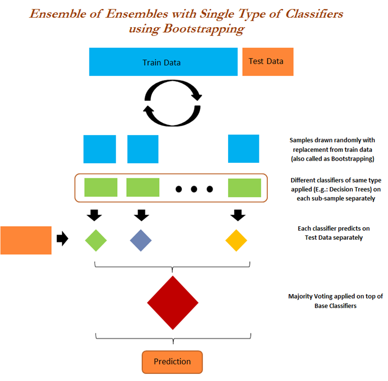 In this methodology, bootstrap samples are drawn from training data and, each time, separate models will be fitted (individual models could be decision trees, random forest, and so on) on the drawn sample, and all these results are combined at the end to create an ensemble. This method suits dealing with highly flexible models where variance reduction will still improve performance: