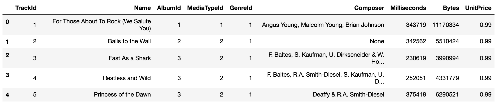 >>> tracks = pd.read_sql_table('tracks', engine)>>> tracks.head()>>> genres = pd.read_sql_table('genres', engine)