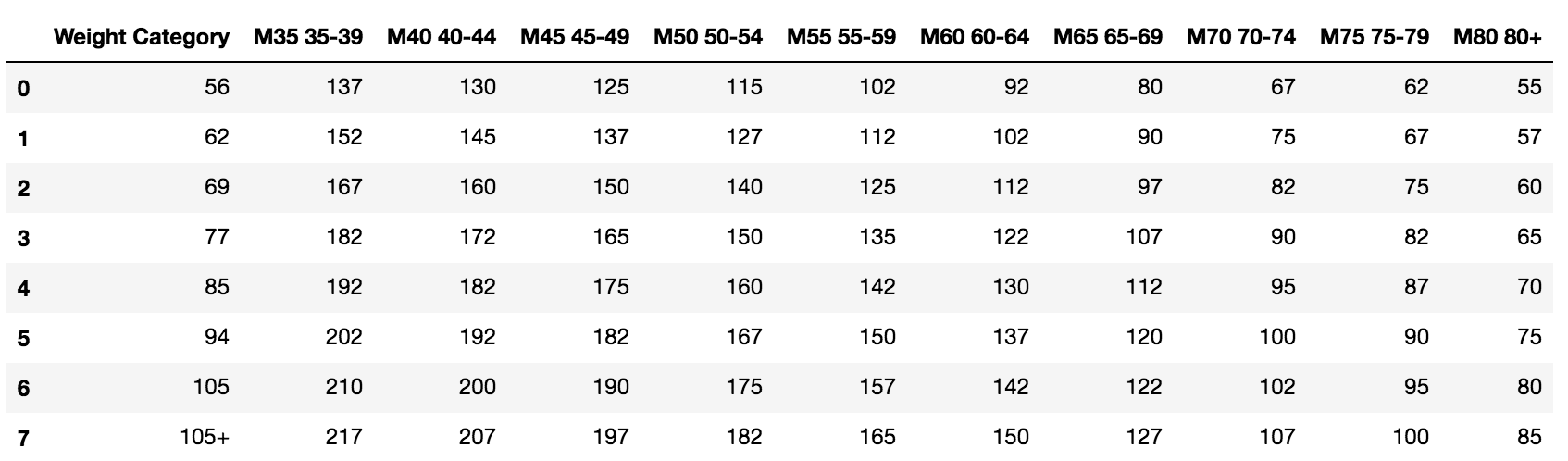 >>> weightlifting = pd.read_csv('data/weightlifting_men.csv')>>> weightlifting