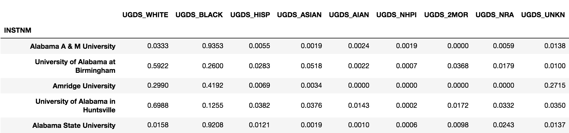 >>> usecol_func = lambda x: 'UGDS_' in x or x == 'INSTNM'>>> college = pd.read_csv('data/college.csv', index_col='INSTNM', usecols=usecol_func)>>> college.head()