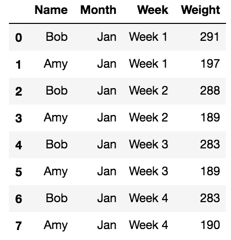>>> weight_loss = pd.read_csv('data/weight_loss.csv')>>> weight_loss.query('Month == "Jan"')