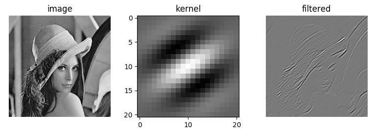 The Gabor filter is a linear filter whose kernel is a 2D Gaussian modulated with a cosine wave. The kernel can be obtained using the cv2.getGaborKernel function, which takes such parameters as kernel size, Gaussian standard deviation, wave orientation, wave length, spatial ratio, and phase. One of the areas where Gabor filters are useful is detecting edges of known orientation.