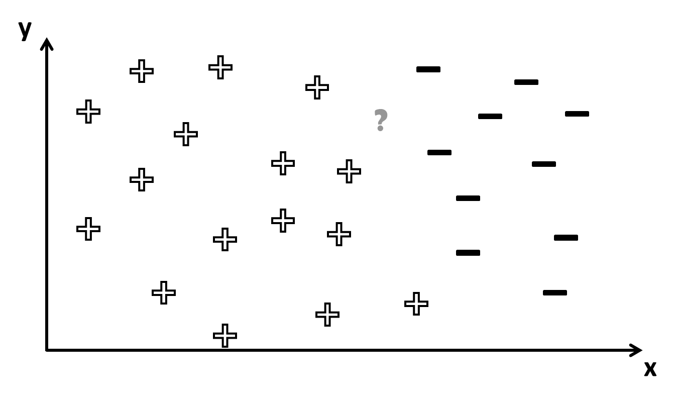 More generally speaking, we want to know which class the ? sign, in the following screenshot, corresponds to, based on the decision boundary we learned during the training phase: