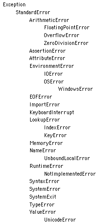 As we've already seen, Python comes with a number of base exceptions and exception classes. All of these can be used and trapped within your scripts to indicate or identify an error. If you are creating new exceptions then you should consider using one of these exceptions as the base class. See Fig 6.1 for an example of the class structure for the exception system.
