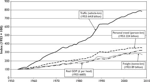 Figure 4.1 shows the increases over the past half-century in passenger movement (measured in person-kilometres), the movement of freight (measured in tonne-kilometres) and road traffic (measured in vehicle-kilometres). It also shows the improvement in the average standard of living (measured in real gross domestic product (GDP) (£) per head), at once both the cause and the effect of the rise in traffic and transport. The data are portrayed in the form of ‘indices’,1 since this enables the trends to be compared despite the different units of measurement.