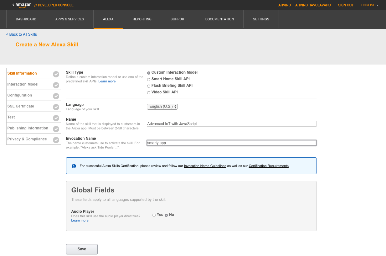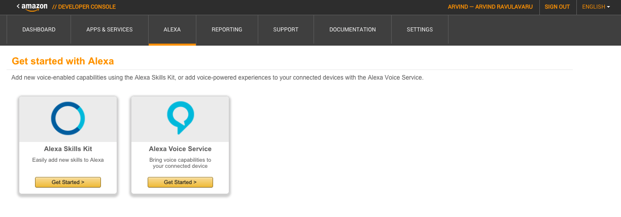 The first thing we are going to do is log in to https://developer.amazon.com. Once we are logged in, click on Alexa on the top section of the page. You should land on a page that should look as follows: