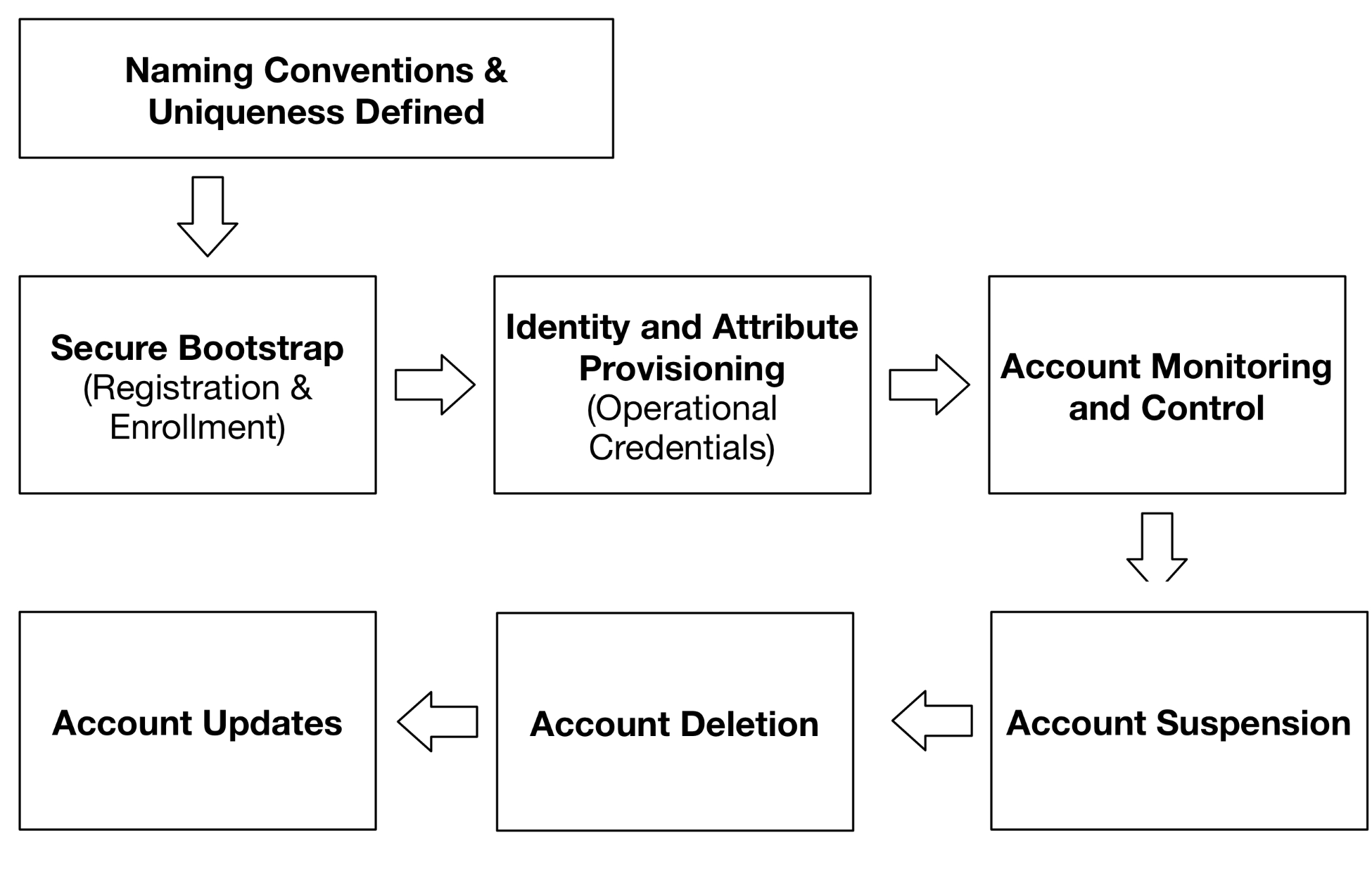Before we begin to examine the technologies that support IAM for the IoT, it is useful to lay out the life cycle phases of what we call identity. The identity life cycle for an IoT device begins with defining the naming conventions for the device; it ends with the removal of the device's identity from the system. The following diagram provides a view of the process flow: