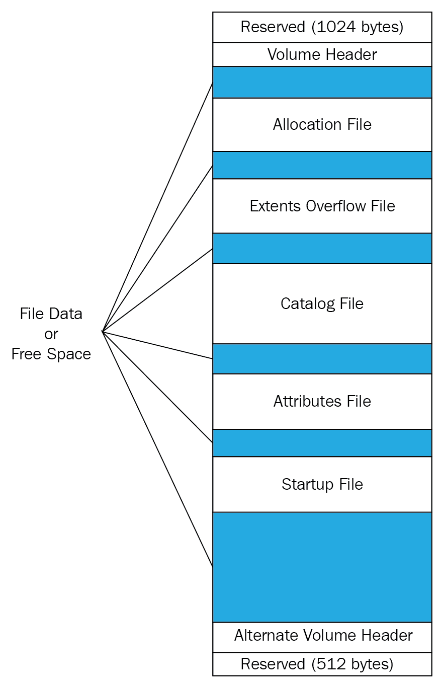The HFS Plus volume contains a number of internal structures to manage the organization of data. These structures include a header, an alternate header, and five special files: an allocation file, an extents overflow file, a catalog file, an attributes file, and a startup file. Among the five files, three files (the extents overflow file, the catalog file, and the attribute file) use a B-tree structure, a data structure that allows data to be efficiently searched, viewed, modified, or removed. The HFS Plus volume structure is shown in the following figure: