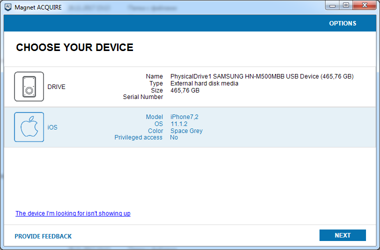 Another free tool capable of logical acquisition is ACQUIRE from Magnet Forensics. Let's perform a logical acquisition again; this time we will image an iPhone running the most recent iOS version 11.1.2 (at the time of writing).