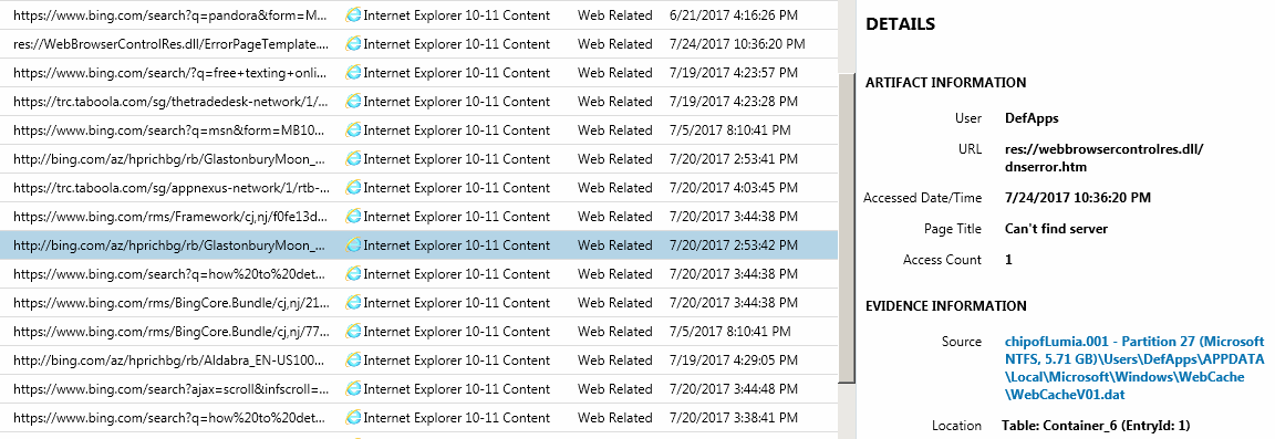 These files can be examined manually, for example, with a hex viewer, or can be parsed automatically with mobile forensic tools. Here is the WebCacheV01.dat file being parsed with Magnet AXIOM:
