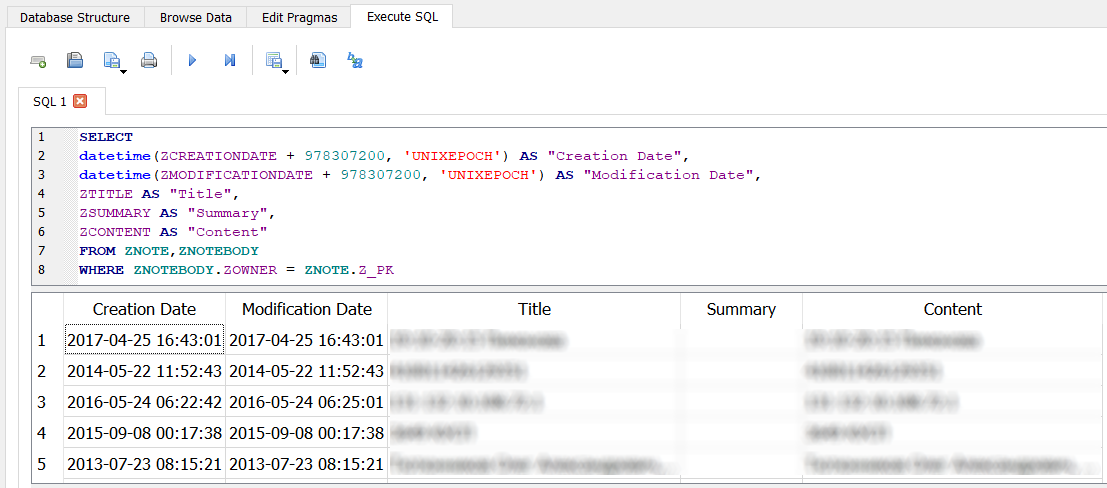 The ZNOTE and ZNOTEBODY tables in the notes.sqlite file contain each note's title, content, creation date, modification date, and more. You can run the following queries to parse the Notes database: