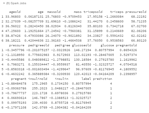 fitted_test <- predict(model, test_normal) SparkR:::registerTempTable(fitted_test,"fitted_tbl_test") head(fitted_test)