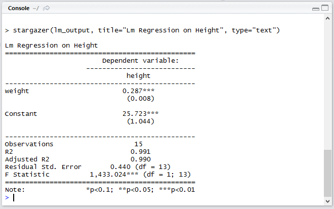 install.packages("stargazer") library(stargazer) stargazer(lm_output, , type="text")