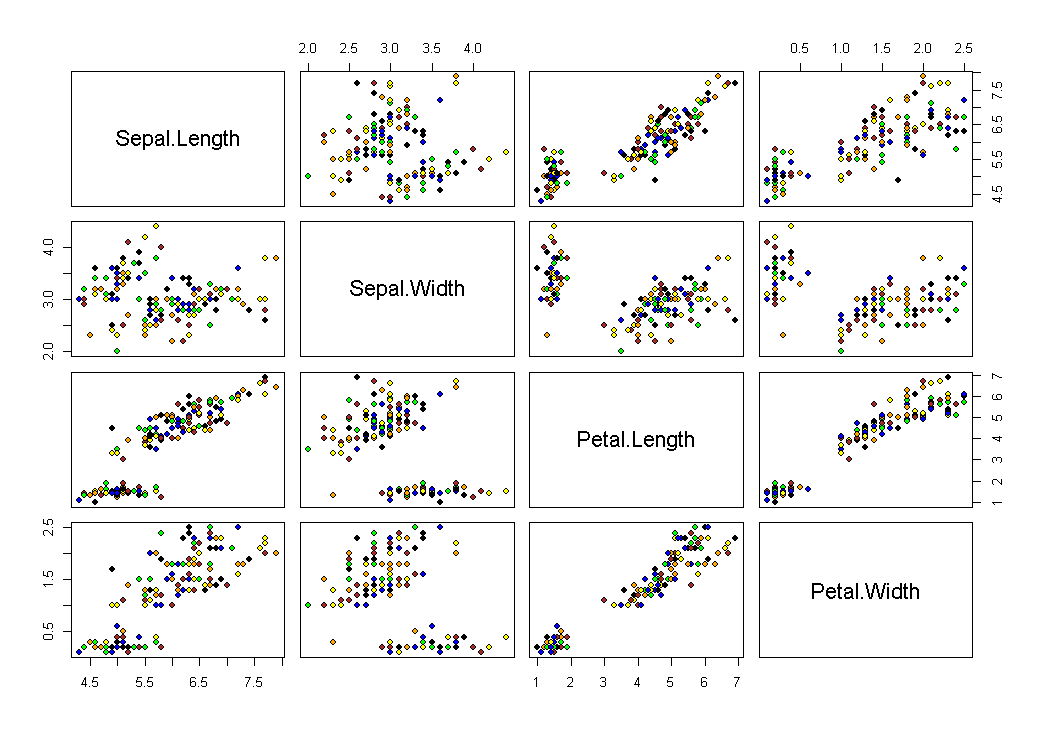 pairs(iris[1:4], bg=c("green","blue","brown","yellow","black","orange"), pch=21)
