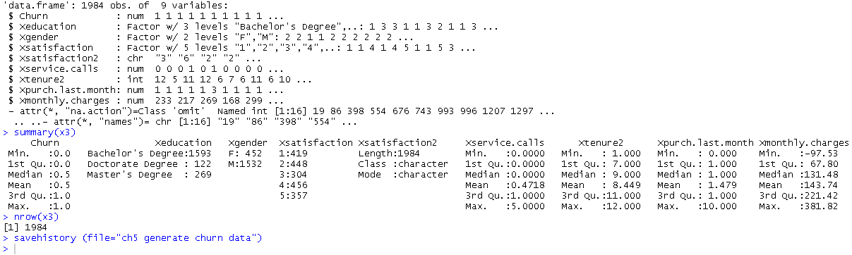 #bind them back together====d1 <- data.frame(xchurn.list)d2 <- data.frame(xnochurn.list)ChurnStudy <- rbind(d1,d2)ChurnStudy <- na.omit(ChurnStudy)summary(ChurnStudy)nrow(ChurnStudy)savehistory (file="ch5 generate churn data")