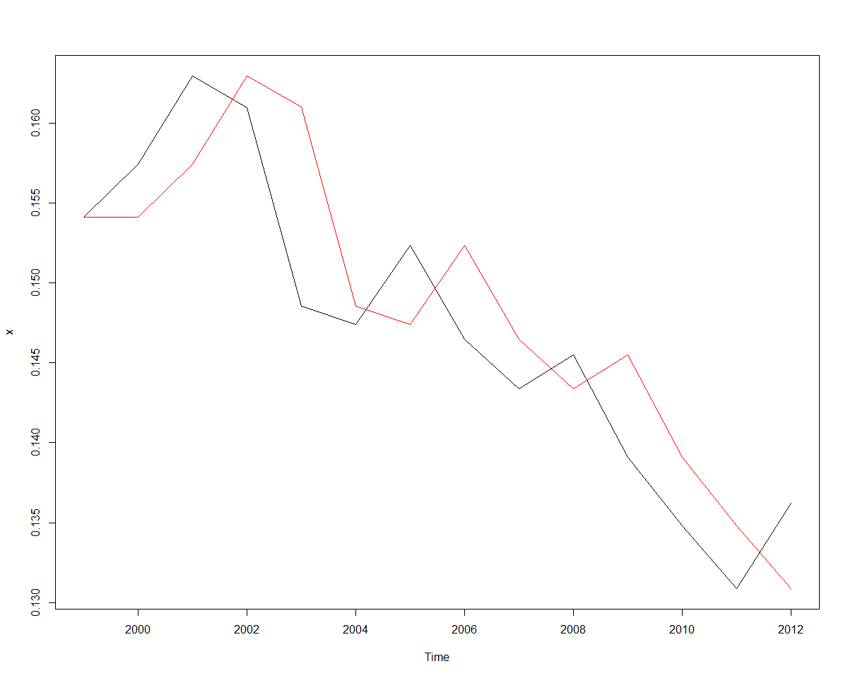 Next, we can plot the predicted versus actual values. Notice that the predicted values are almost identical to the actual values; however, they are always one step ahead: