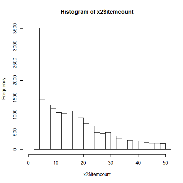 hist(x2$itemcount, breaks = 500, xlim = c(0, 50))