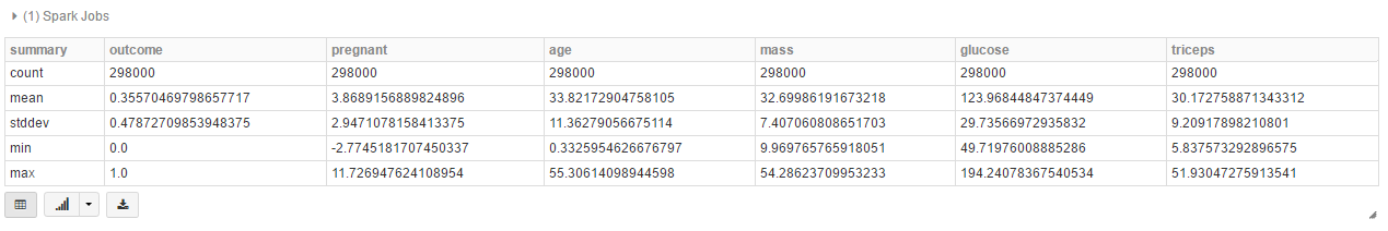 #set the test data set to include the rest of the population set.seed(123) test <- filter(out_sd, out_sd$sample_bin <= Cutoff_low | out_sd$sample_bin >= Cutoff_high) test_sumdf = describe(test) display(select(test_sumdf,"summary","outcome","pregnant","age","mass","glucose","triceps"))