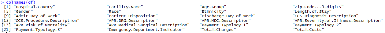 Running the colnames() function is a convenient way of obtaining the index numbers for each of the variables. Using index numbers in R functions is a convenient and fast way of referencing variables.