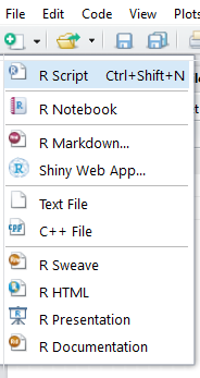 Begin by creating another R script by selecting File | New File | R Script from the top navigation bar. If you create new scripts via File | New File | R Script often enough you might get Click Fatigue (uses three clicks), so you can also save a click by selecting the icon in the top left with the + sign: