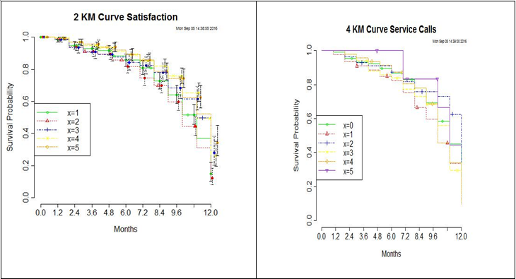 par(mfrow=c(1,1))plotsurv(ChurnStudy$Xsatisfaction,c(1:5),c('bars'))title(main = "2 KM Curve Satisfaction")/dev.copy(jpeg,'Ch5 - 2 KM Curve Satisfaction.jpg'); dev.off()plotsurv(as.factor(ChurnStudy$Xservice.calls),c(1:6),c('none'))dev.copy(jpeg,'Ch5 - 4 KM Curve Service Calls.jpg');title(main = "4 KM Curve Service Calls")dev.off()