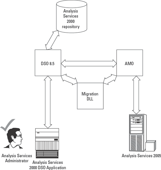If you have experience with DSO (object model used for managing Analysis Services 2000), we expect you will find AMO straightforward. The good news is that if you have imported your Analysis Services 2000 database to Analysis Services 2005, you can still make those client apps written for Analysis Services 2000 work. This is accomplished using the version of DSO shipped with Analysis Services 2000 Service Pack 4 along with some additions. We refer to the DSO installed with SQL Server 2005 as DSO8.5. If you have an existing DSO application you will be able to use that application to manage the upgraded or migrated database as long as there has been no changes to the migrated database using SQL Server 2005 tools. The overall architecture showing how an existing DSO application can communicate with Analysis Services 2005 is shown in Figure 12-32.