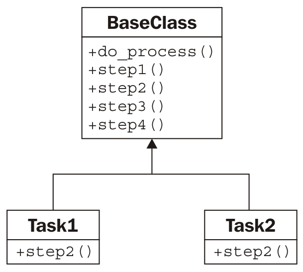 The template pattern is useful for removing duplicate code; it's intended to support the Don't Repeat Yourself principle we discussed in Chapter 5, When to Use Object-Oriented Programming. It is designed for situations where we have several different tasks to accomplish that have some, but not all, steps in common. The common steps are implemented in a base class, and the distinct steps are overridden in subclasses to provide custom behavior. In some ways, it's like a generalized strategy pattern, except similar sections of the algorithms are shared using a base class. Here it is in the UML format:
