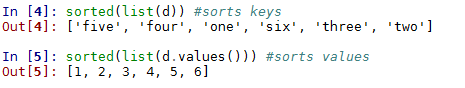 Note that the first line in the preceding code sorts the keys according to alphabetical order, and the second line sorts the values in order of integer value.