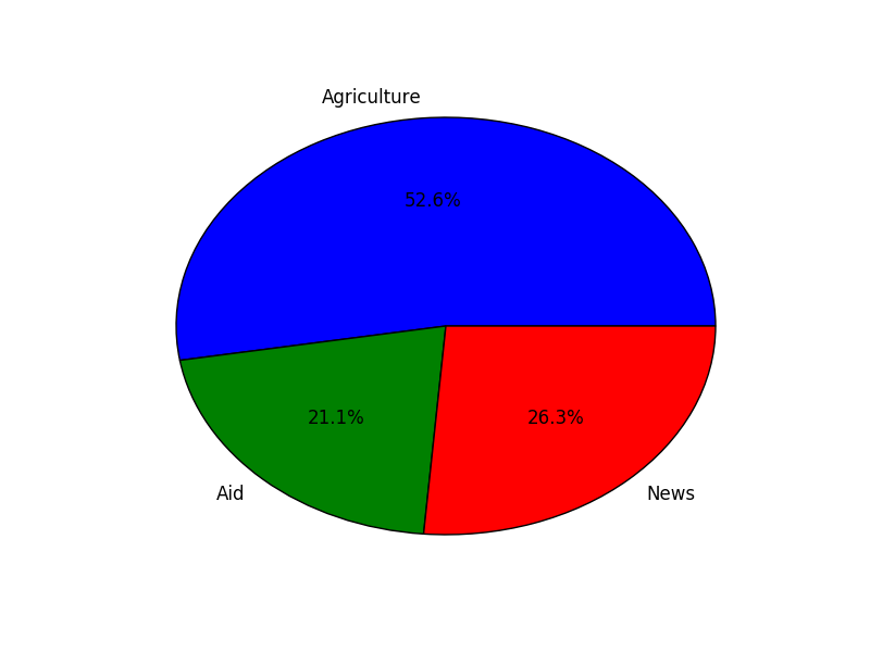 import matplotlib.pyplot as plt data = [500, 200, 250] labels = ["Agriculture", "Aide", "News"] plt.pie(data, labels=labels,autopct='%1.1f%%') plt.show()
