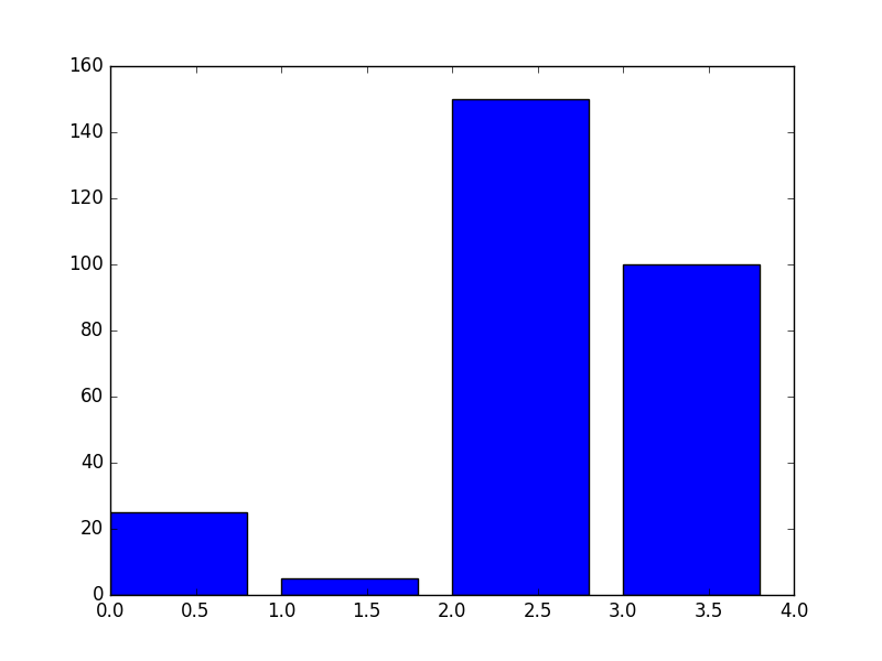 import matplotlib.pyplot as plt data = [25., 5., 150., 100.] x_values = range(len(data)) plt.bar(x_values, data) plt.show()