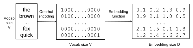 Words from the vocabulary with size V are transformed into one-hot encoding vectors of size V (each word is encoded uniquely). Then, the embedding function transforms this V-dimensional space into a distributed ...
