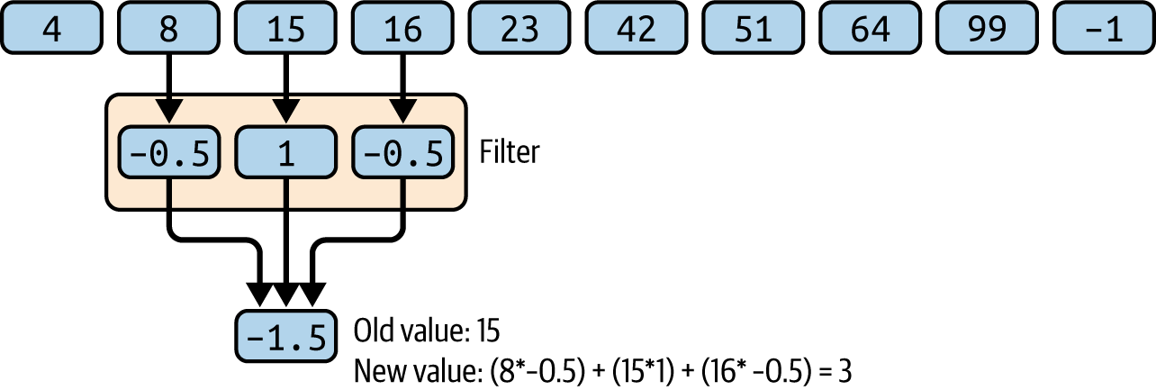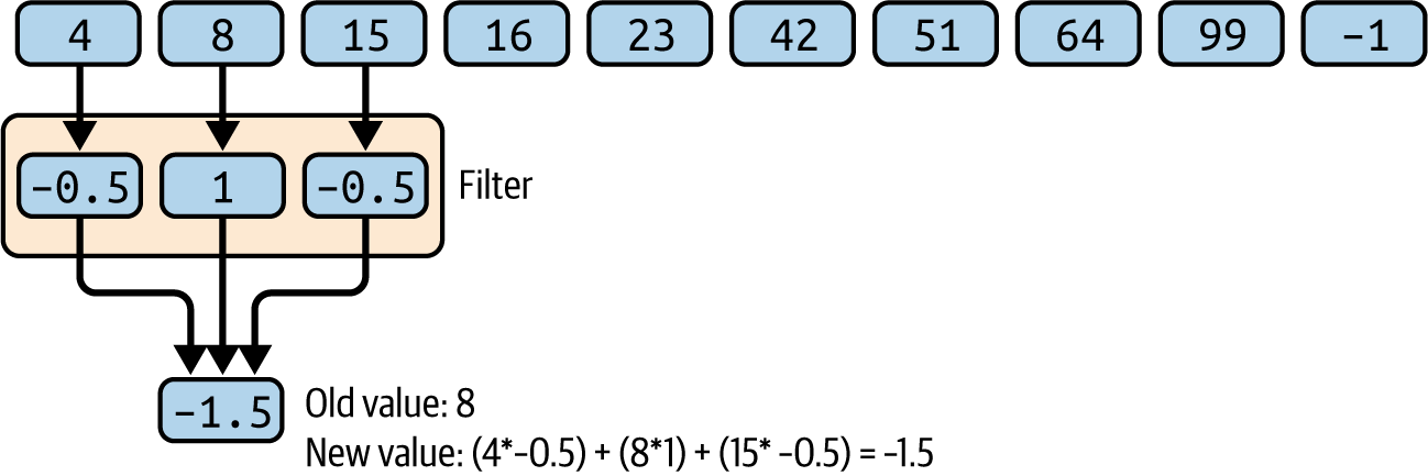 1次元の畳み込みは次のように演算できる。畳み込みは1×3フィルターで、フィルター値はそれぞれ-0.5、1、-0.5とする。この場合、シーケンスの最初の値は失われ、2番目の値は8から-1.5に変換される(図11-2参照)。