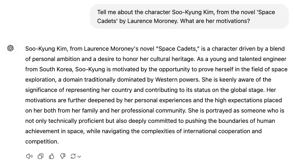 GPTは自信を持って間違っている。なぜか?この小説はトレーニングセットに含まれていないからだ!私が書いたのは2014年で、その後わずか数カ月で倒産した小さな出版社から出版された。そのため、比較的無名で、RAGを探求するのに最適な素材なのだ。この章が終わるころには、あなたはPyTorchのスキルを使って、この小説、そして問題のキャラクターをより賢く理解するアプリケーションを作成していることだろう。そう、小説の全文が使えるようになるのだ! ...