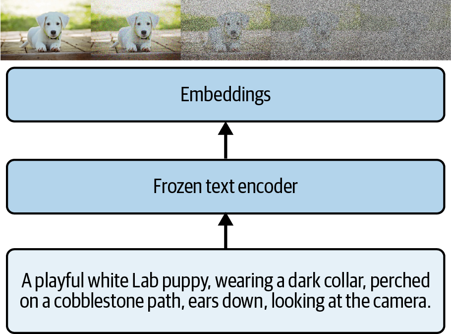 しかし、ノイズ画像を作成するステップ( )に戻り、そこに非常に冗長な説明のテキストを追加したらどうなるだろうか?すると、ノイズ画像にテキスト・ラベル(埋め込みで表現)が付加される(図19-2参照)!