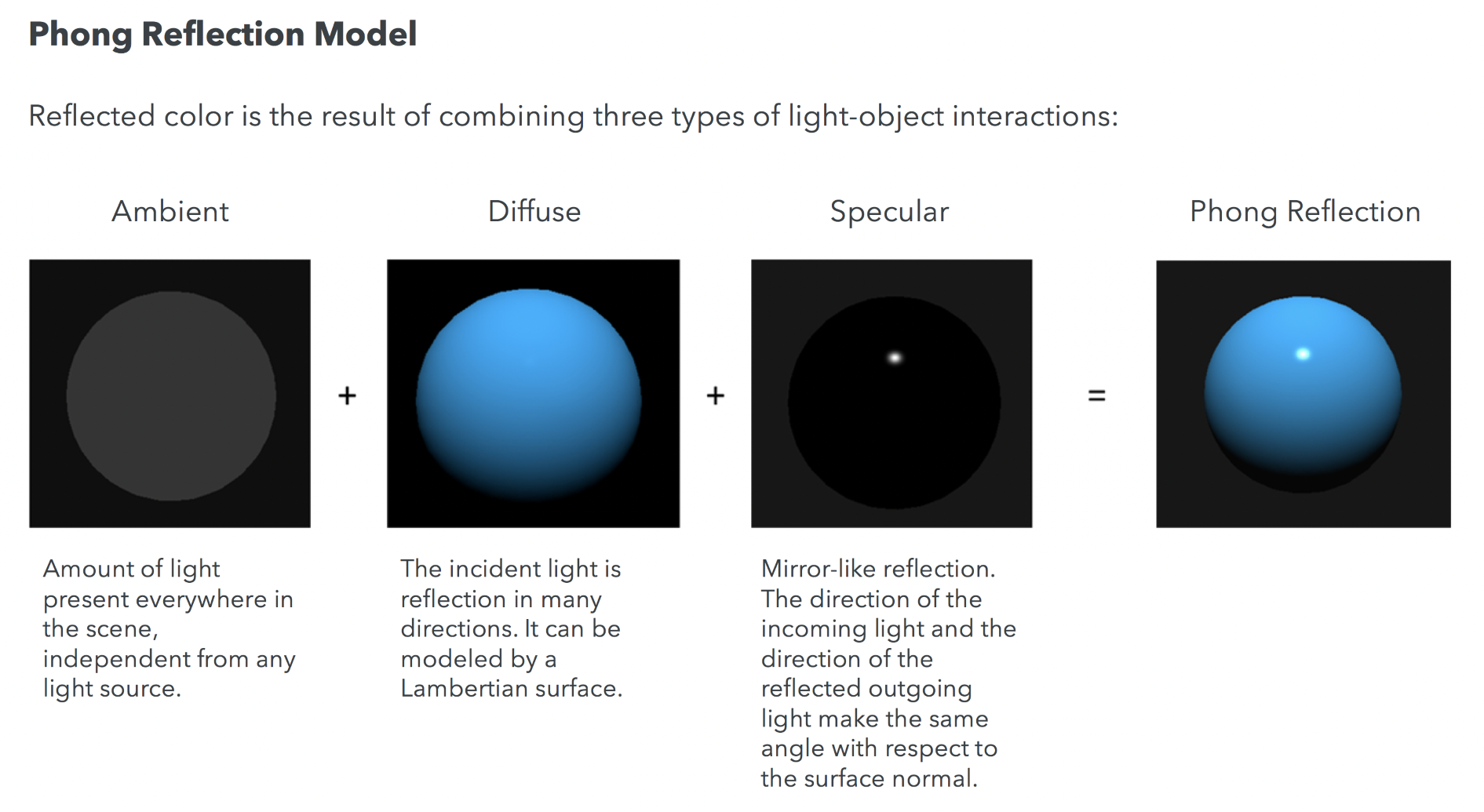 The Phong reflection model describes the way a surface reflects the light as the sum of three types of reflection: ambient, diffuse, and specular. It was developed by Bui Tuong Phong, who published it in his 1973 PhD dissertation: