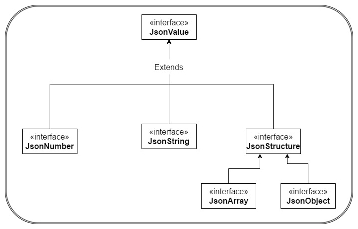 javax.json.JsonValue is a top-level interface used to represent the node value types of JSON data, as shown ahead: