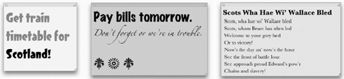 The Stickies application can be very useful. Use it to leave notes to yourself or to others who might use your Mac. Create your shopping list, notes on your upcoming presentation, gossip, snippets for poems you will write later, tidbits to add to your research, interesting stuff from web pages, etc. Below are examples of Stickies and the sorts of things you can do with them.