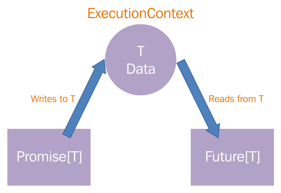 As shown in the preceding diagram, Future[T] contains a computation task of type T. Promise[T] executes that computation task T in ExecutionContext and writes the results back into the Future[T].