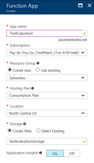 To create your first Azure Function, navigate to Azure Management Portal at https://portal.azure.com. In the left-hand side pane, navigate to New | Compute | Function App. The parameters in the following screenshot will be explained next: