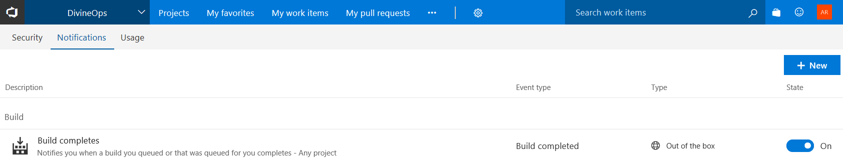 You can configure which notifications are on in the main VSTS configuration -> Notifications, as shown in the following screenshot: