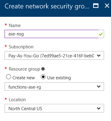 As mentioned earlier, Network Security Groups (NSGs) are network firewalls protecting Azure VMs and subnets. Since the new Function App we've deployed on ASE is deployed on a private subnet, we can now protect it with an NSG. NSG will allow us to restrict unwanted traffic to the application.