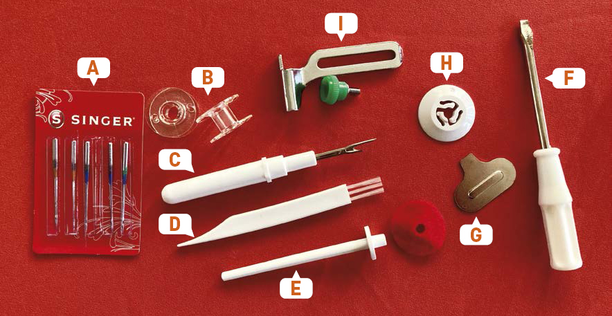 E. auxiliary spool pin with felt washer (for a second thread spool)