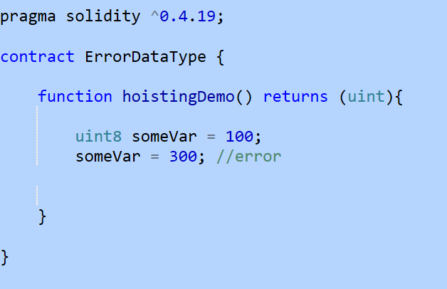 By now, we know that Solidity is a statically typed language, where variables are defined with specific data types at compile time. The data type cannot be changed for the lifetime of the variable. It means it can only store values that are legal for a data type. For example, uint8 can store values from 0 to 255. It cannot store negative values or values greater than 255. Take a look at the following code to better understand this: